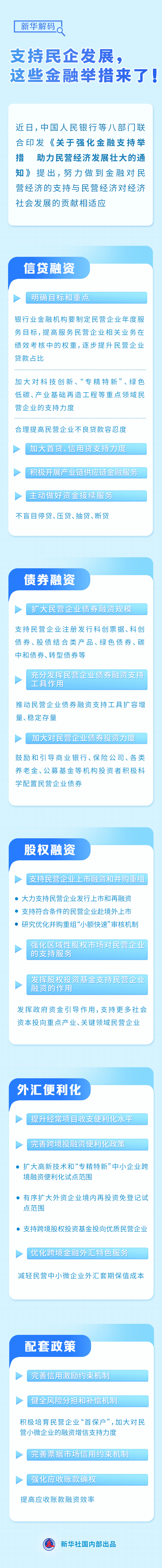 民营经济发展壮大离不开资金支持。中国人民银行等八部门近日联合印发《关于强化金融支持举措 助力民营经济发展壮大的通知》,推出25条具体举措,持续加强民营企业金融服务。通过记者梳理,一起看看这些举措将如何支持民企融资。