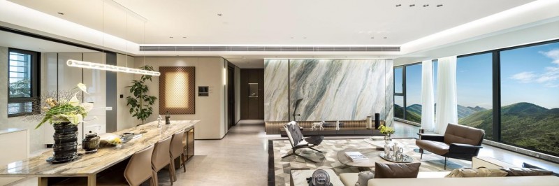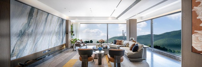 考虑到青岛海洋性气候特点,和樾府采用了造价昂贵的木饰面作为室内基调,让空间氛围更为质朴温润,精心选定碧海伽蓝等高端岩板,窗外是崂山山居式盛景,室内凝固着海的澎湃跃动,一席尽藏山海。