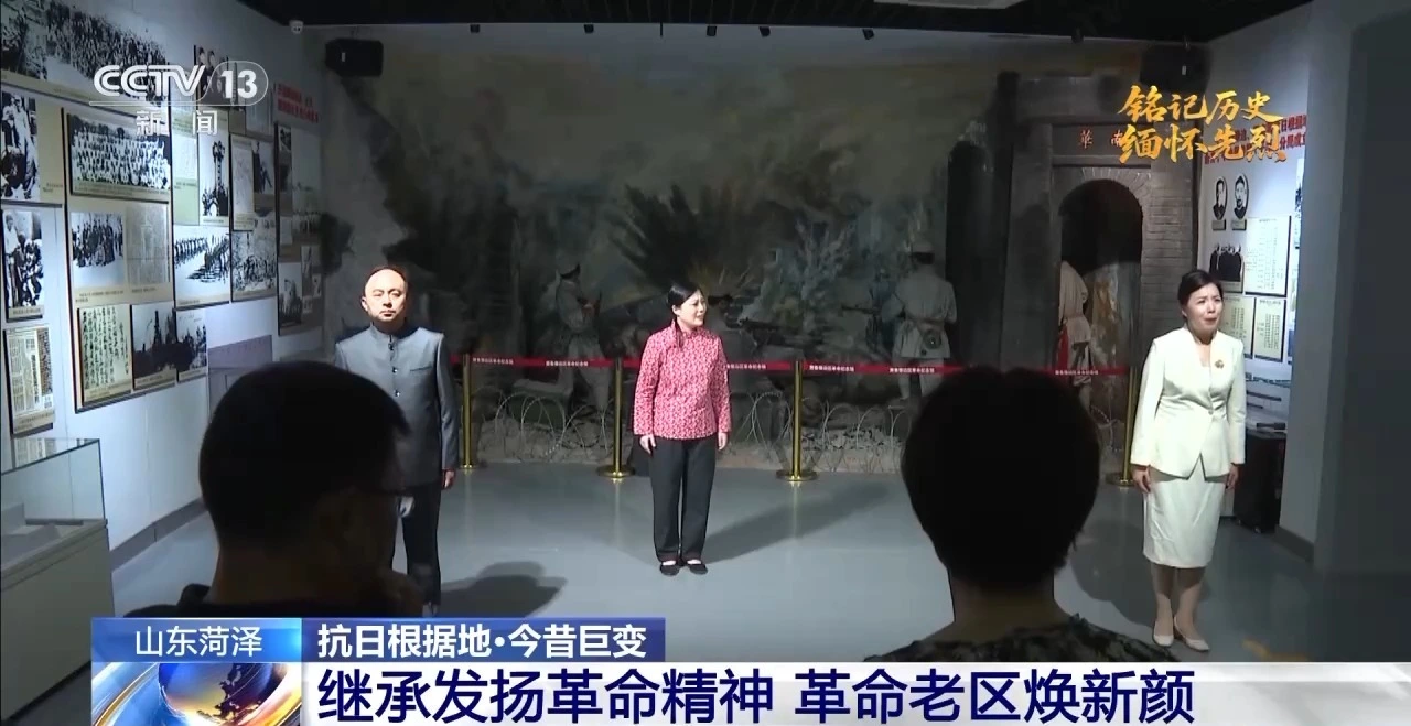 80多年过去了,革命前辈们的精神在冀鲁豫大地上得到了继承和发扬。正在纪念馆里表演的,是菏泽市郓城县抗日红色情景剧《亲娘》,讲述郓城数十位乳娘哺育、养大革命遗孤的感人故事。现在,菏泽市每年演出红色短剧、情景剧等270余场次,进行红色宣讲400余场次,深受广大干部群众喜爱。