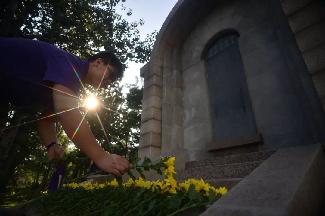 2015年9月3日,在天津南开大学校园内的西南联合大学纪念碑前,师生代表向南开抗战英烈献花