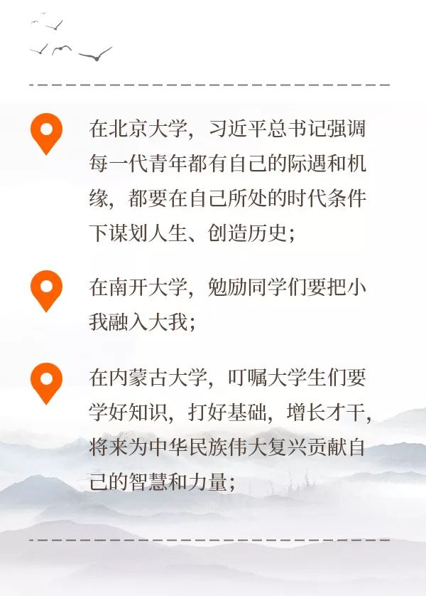 “新时代中国青年要珍惜这个时代、担负时代使命,在担当中历练,在尽责中成长,让青春在新时代改革开放的广阔天地中绽放,让人生在实现中国梦的奋进追逐中展现出勇敢奔跑的英姿,努力成为德智体美劳全面发展的社会主义建设者和接班人!”