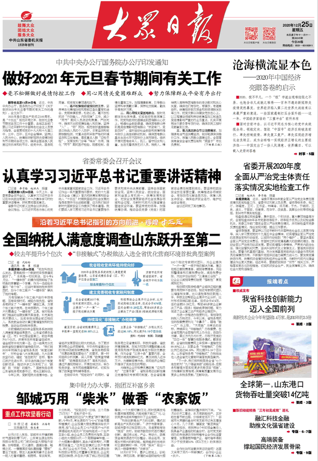 12月25日出版的大众日报1版推出报道《全国纳税人满意度调查山东跃升至第二》,对我省做法进行解读。