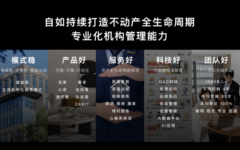 在产品好方面,自如以可租、可售、可自住作为标准,不断投入产品研发、提升交付水平,推出了全系列产品矩阵,为业主提供一站式房屋资产升级方案,提高出租效率、保障出租收益。例如,面向业主精简装房源,提供一站式房源焕新增值的速优家产品;面向业主老旧毛坯房源,提供艺术设计智能整装的心舍、友家产品;面向业主高端住宅,提供豪宅委托的曼舍;面向机构业主的整栋或多栋物业,提供整栋租赁社区服务的自如寓、自如里;面向海外出租机构,提供的国际租房平台自如比邻Zabit。
