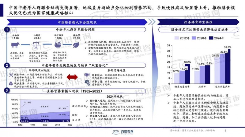 调研报告深入剖析了我国中老年群体膳食结构失衡的现状。数据显示,中老年群体动物性食品摄入量偏高,精制碳水化合物摄入过多,而植物性食品和膳食纤维的摄入则明显不足。这种膳食结构的不合理性,已经显著提升了糖尿病、高血压、肥胖等慢性病的患病率。此外,地区间与城乡间的营养摄入水平差异显著,进一步加剧了中老年群体罹患慢性病的风险。