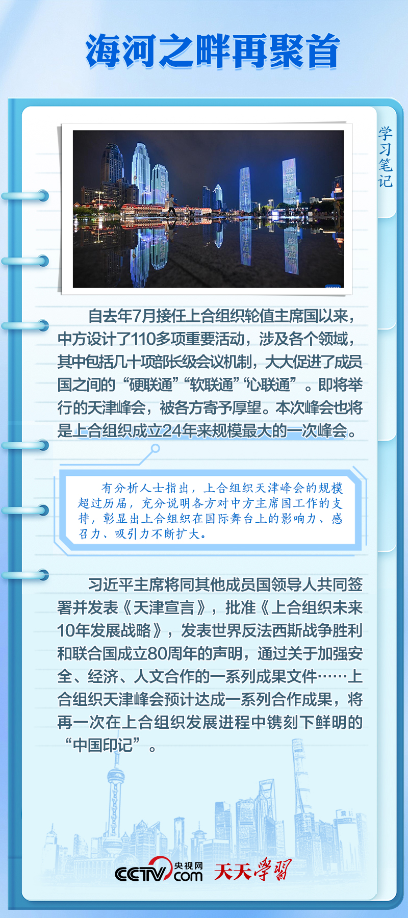 天天学习8月31日至9月1日,2025年上海合作组织峰会将在天津举行。习近平主席将同20多位外国领导人和10位国际组织负责人聚首海河之滨,出席上合组织成立以来规模最大的一次峰会。