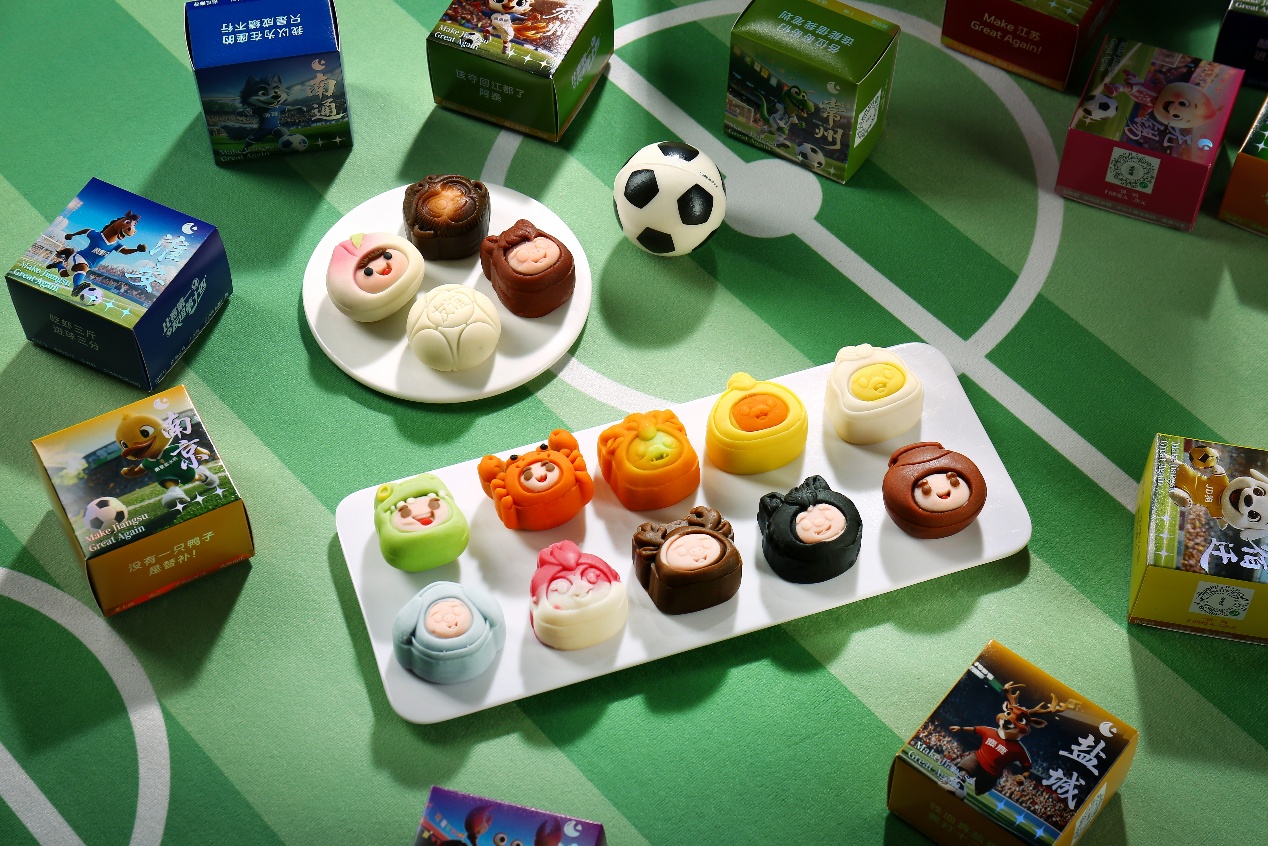 苏州稻香村的健康创新,不止于食材与技术,更延伸到消费场景与文化表达。今年中秋推出的⌈散装江苏十三太保⌋月饼伴手礼,在健康基础上注入趣味:14款吉祥物造型月饼(覆盖江苏13座参赛城市及“友谊第十四”款),食材延续低糖低脂,命名则紧扣城市特色与苏超热梗,如“浪里马(芸沙枸杞淮山药月饼)”、“苏得起(碧螺春茶月饼)”,消费者扫码还能观看“十三太保踢球”动画,实现“健康+趣味”的双重体验。