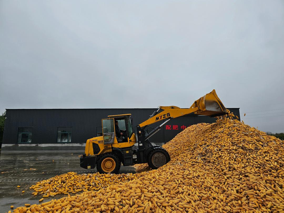 10月9日,记者在该粮食烘干点看到,一辆辆铲车正不断把散落的玉米堆成座座小山,经过脱粒后送往烘干机和烘干塔。
