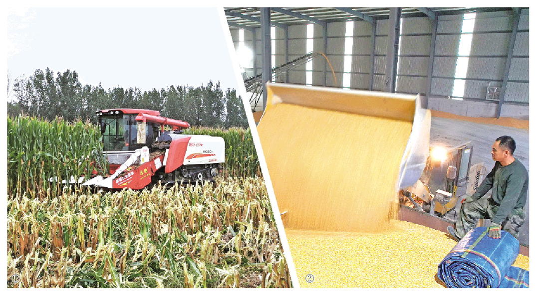 图①:10月9日,肥城市安驾庄镇朱家颜子村秋收现场。(□记者李培乐通讯员董效晏报道) 图②:10月9日,东营市东营区谭家大棚种植农民专业合作社里,工作人员对已经烘干的玉米进行装车收储。(□通讯员缪宏伟报道)
