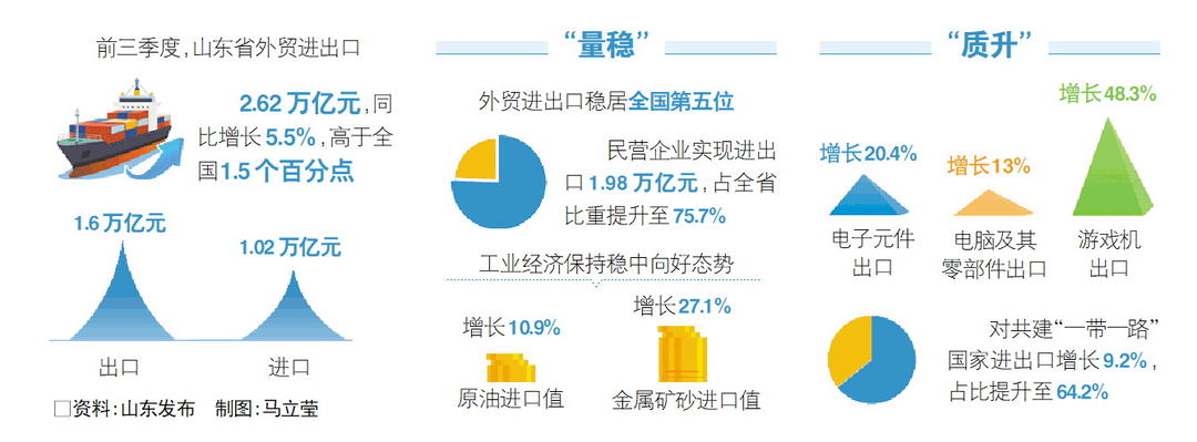 前三季度,山东外贸进出口稳居全国第五位。出口、进口均衡发展,增速均超过5%,规模均创历史同期新高。出口已连续7个季度保持增长,进口也延续了3个季度的增长态势。
