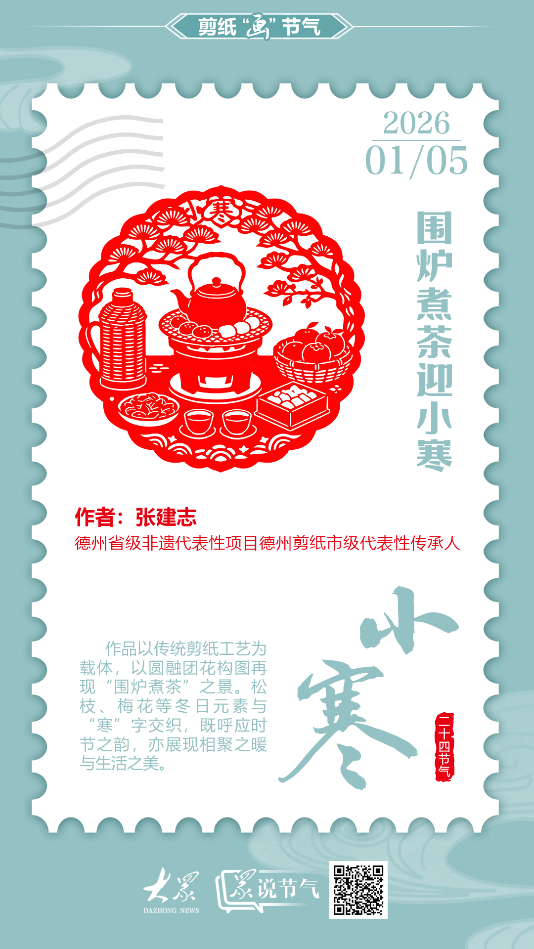 创作思路:作品以传统剪纸工艺为载体,以圆融团花构图再现“围炉煮茶”之景。松枝、梅花等冬日元素与“寒”字交织,既呼应时节之韵,亦展现相聚之暖与生活之美。