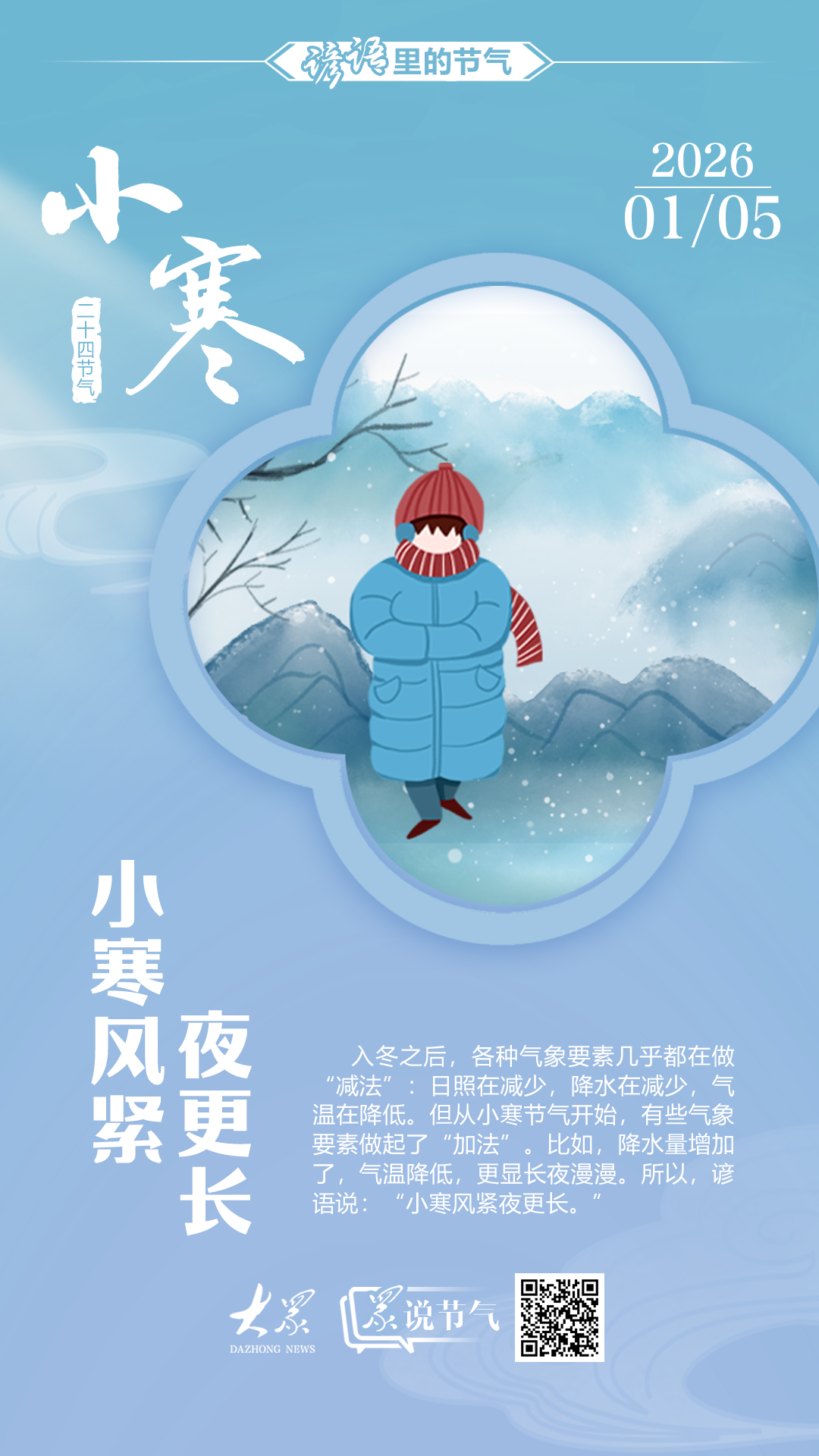 入冬之后,各种气象要素几乎都在做“减法”:日照在减少,降水在减少,气温在降低。但从小寒节气开始,有些气象要素做起了“加法”。比如,降水量增加了,气温降低,更显长夜漫漫。所以,谚语说:“小寒风紧夜更长。”
