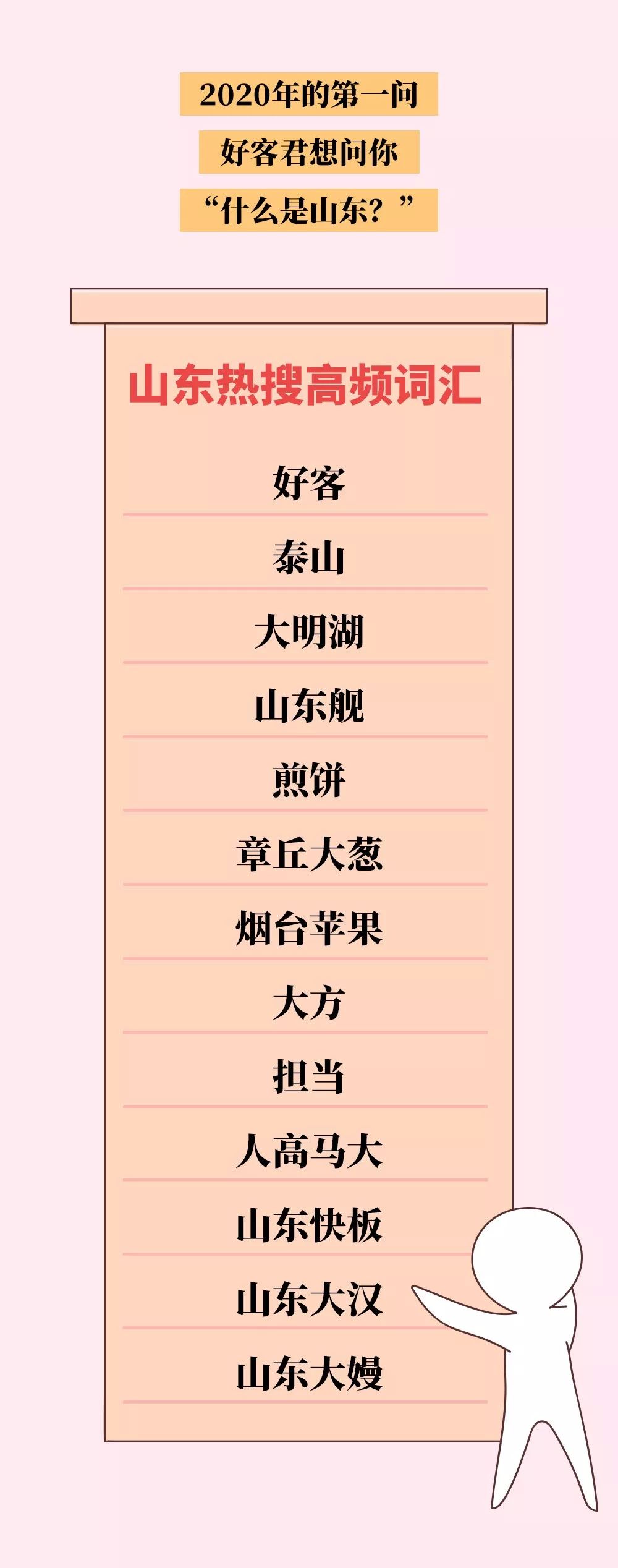 你的每一次点击、转发、评论,都让好客君相信,好看、好听、好学、好吃、好玩、好买的山东,已经通过文字触达到了每一个陪伴我们的你。 在过去的365天里,《山东,你怎么那么周杰伦!》,《凌晨三点就排队!这碗“糁”到底是sà?》,《新鲜出炉!2019中国最具幸福感城市榜单!山东5个城市上榜!你的家乡幸福吗?》……我们尽全力回答你对好客山东的每一个疑问,也期待我们的答案能让你对山东有更进一步的了解。 新年的第一天,好客君真心地想问你:“什么是山东?”,你真的明白了吗?