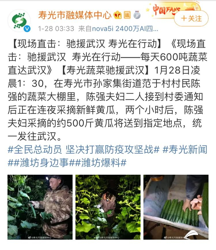 从1月28日开始,寿光每天向武汉提供平价新鲜蔬菜600吨。寿光供给武汉的蔬菜包括黄瓜、西红柿、青椒、茄子等20多个品种。为了确保蔬菜的新鲜程度和积极引导蔬菜企业及专业合作社进行生产,不少村民凌晨就摘起了黄瓜。