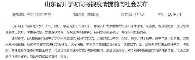 2月26日,山东省教育厅发布通知,决定继续开展线上教育,学生不返校。对于初中、高中毕业年级学生,采取网络直播、在线教学的方式进行学业辅导。大专院校、中职学校开展好线上教育教学。幼儿园、特殊教育学校不开展线上教学。