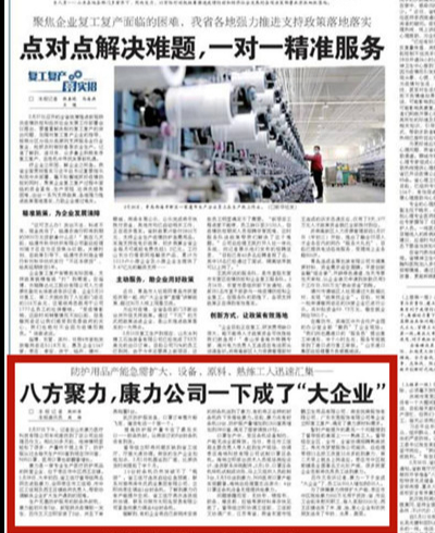“我们全力支持康力,大家携起手来,坚决打赢这场没有硝烟战争。”八方聚力,如今的康力员工从200人增加到500人,已经成了大企业,防护服从过去每天生产600套到现在日产2800套,全部由国家调拨支援湖北。
