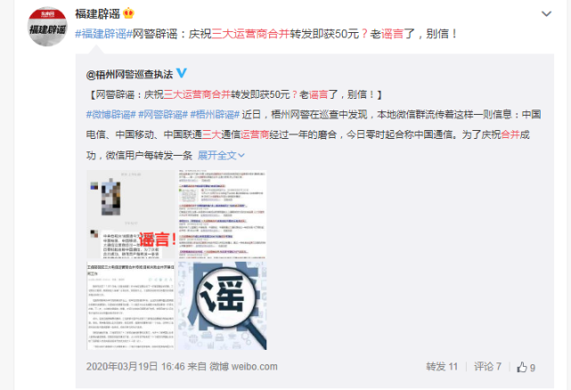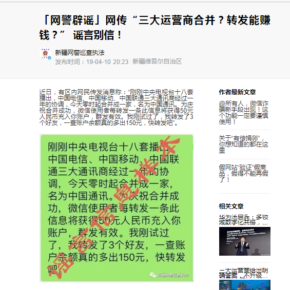 2019年4月,新疆网警分析:此类虚假信息中含有赠送通讯费、积分等诱惑内容,网友信以为真转发给好友,从而形成一定扩散面。其传播达到一定规模后,易披上“以假乱真”的外衣,造成恶劣影响。