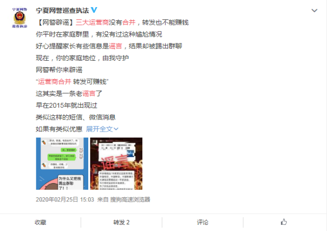 2020年2月,宁夏网警犀利指出:三大运营商没有合并,转发也不能赚钱。