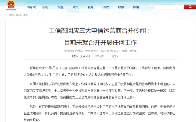 再次,2015年11月5日,工信部曾回应三大电信运营商合并传闻称:目前未就合并开展任何工作。