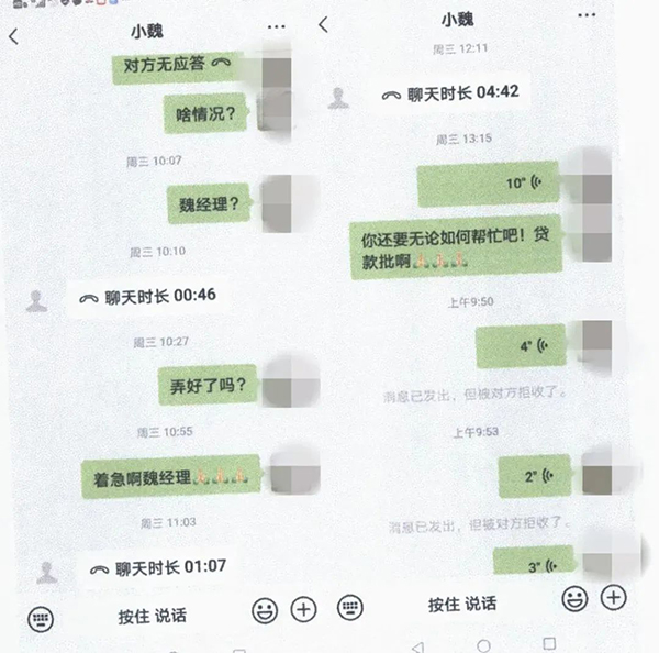 钱转过去了,没想到,刘先生问业务员“小魏”索要10万元贷款时,对方就把他拉黑了,头像也变成了空白图片,之前加的“知名银行”企业微信也找不到了。