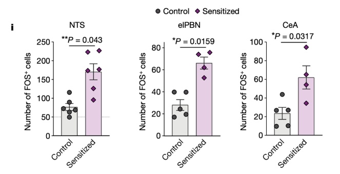 一次过敏原攻击就可以激活小鼠大脑的孤束核(NTS)、外侧臂旁核(elPBN)和中央杏仁核(CeA),这些大脑部位参与了对不愉快刺激的厌恶反应。[1]