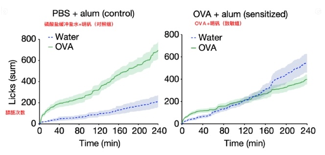 耶鲁大学的研究人员用卵清蛋白(OVA)给小鼠致敏后(也就是让小鼠下次遇见OVA时会发生过敏反应),发现致敏后的小鼠舔舐卵清蛋白的次数在减少,更偏好舔舐水;但是没有致敏的对照组小鼠没有这个现象,舔舐卵清蛋白的次数比水多。[1]