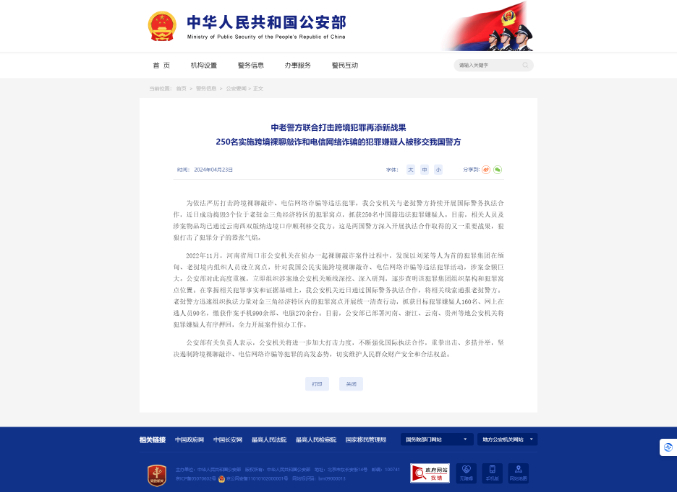 为依法严厉打击跨境裸聊敲诈、电信网络诈骗等违法犯罪,我公安机关与老挝警方持续开展国际警务执法合作,近日成功捣毁3个位于老挝金三角经济特区的犯罪窝点,抓获250名中国籍违法犯罪嫌疑人。目前,相关人员及涉案物品均已通过云南西双版纳边境口岸顺利移交我方。这是两国警方深入开展执法合作取得的又一重要战果,狠狠打击了犯罪分子的嚣张气焰。