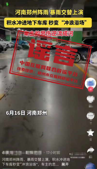 真相:近日,网上流传内容为“6月16日,河南郑州,积水冲进地下车库”的视频。经郑州市金水区文化路办事处证实,该视频首发于2021年7月,并非2024年6月16日发生,视频显示画面亦非视频定位所在小区,该小区并未发生地下车库进水情况。以上信息内容不实,系翻炒旧闻。(来源:郑州市互联网举报和辟谣平台)