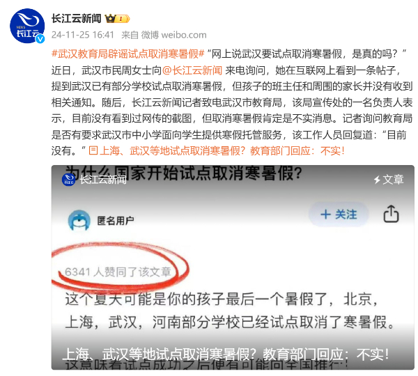 随后,记者致电武汉市教育局,该局宣传处的一名负责人表示,取消寒暑假肯定是不实消息。记者询问教育局是否有要求武汉市中小学面向学生提供寒假托管服务,该工作人员回复道:“目前没有。”