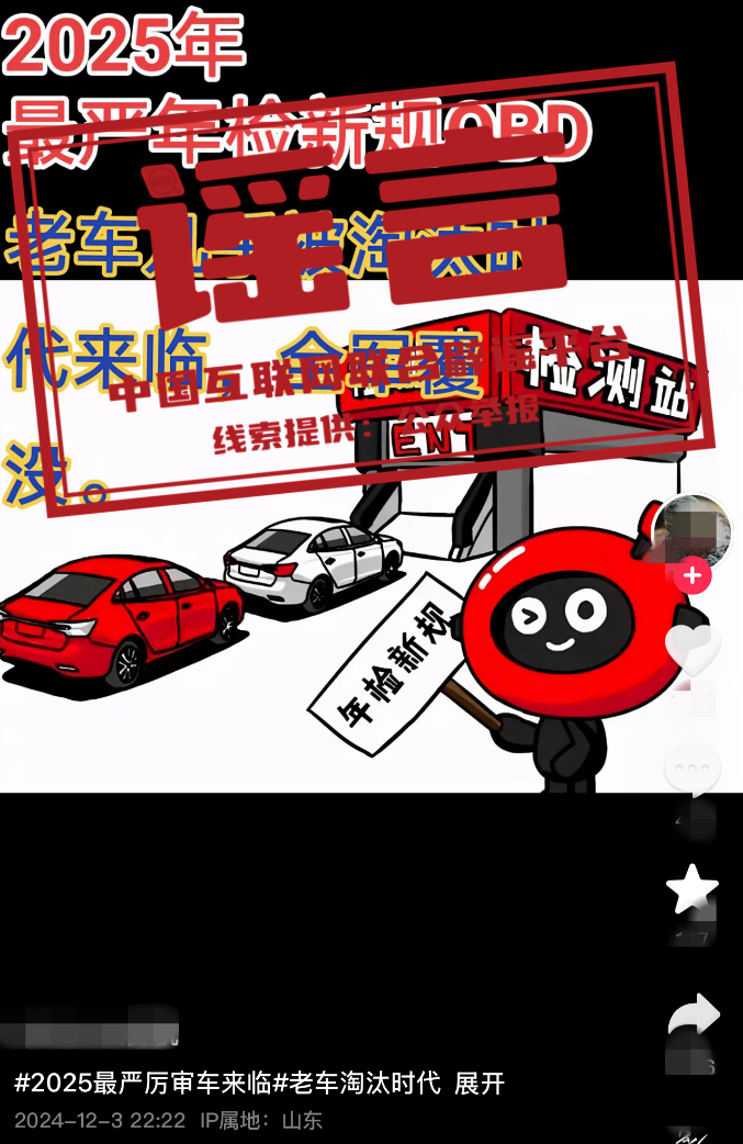 真相:近日,多个自媒体账号发布消息,宣称“史上最严车检来了”“车检年限变化”“燃油车年检增加OBD检测”等。中央广电总台中国之声记者多方求证了解到,上述说法均为不实消息,目前各地车检并没有新变化。