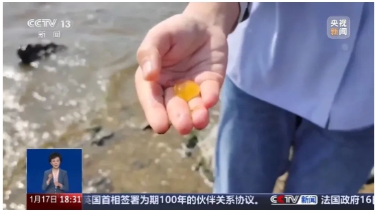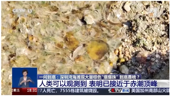 记者来到深圳湾公园的海风运动公园看到,这一海域出现了大量类似“爆爆珠”的气泡状悬浮物,不少悬浮物还被海浪冲上了沙滩。