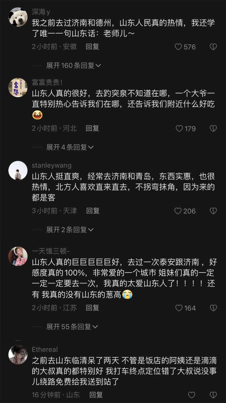 在该男生视频的留言区,网友们对山东的好感度也蹭蹭往上涨,分享着和好客山东的暖心小故事。