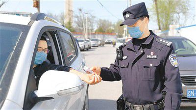 民警门振昌在给司机检测体温