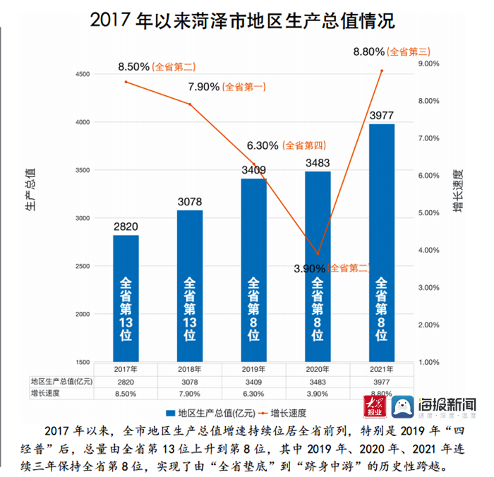 “这五年,菏泽脚踏实地、强基兴业,经济实力大幅提升,主要经济指标增速连年位居全省前列,实现了由“全省垫底”到“跻身中游”的历史性跨越。”张新文列出了一组详尽的数据,菏泽地区生产总值由2653亿元增加到3977亿元,前移5个位次、跃居全省第8位;一般公共预算收入由185亿元增加到283.9亿元,近三年占全省比重提升0.72个百分点,总量前移5个位次、跃居全省第9位。