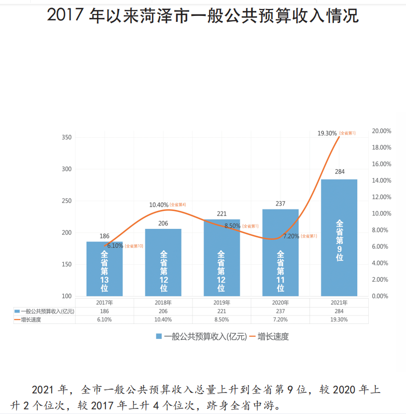 新春伊始,菏泽大地充满勃勃生机。刚刚闭幕的中国共产党菏泽市第十四次代表大会,披露的一组数据让人振奋:地区生产总值由2653亿元增加到3977亿元,前移5个位次、跃居全省第8位;一般公共预算收入由185亿元增加到283.9亿元,近三年占全省比重提升0.72个百分点,总量前移5个位次、跃居全省第9位,实现了由“全省垫底”到“跻身中游”的历史性跨越。