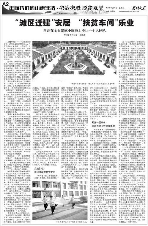 素有“中国牡丹之都”之称的菏泽,位于鲁苏豫皖四省交界地带,是山东省两个扶贫工作重点市之一,也是全省脱贫攻坚的主战场。近年来,菏泽深入贯彻落实习近平总书记关于扶贫工作的重要论述和党中央决策部署,大力实施精准扶贫、精准脱贫,累计减贫170.15万人,基本完成脱贫攻坚任务,并探索构建扶贫的长效机制,形成了一系列可复制可推广的成功经验。