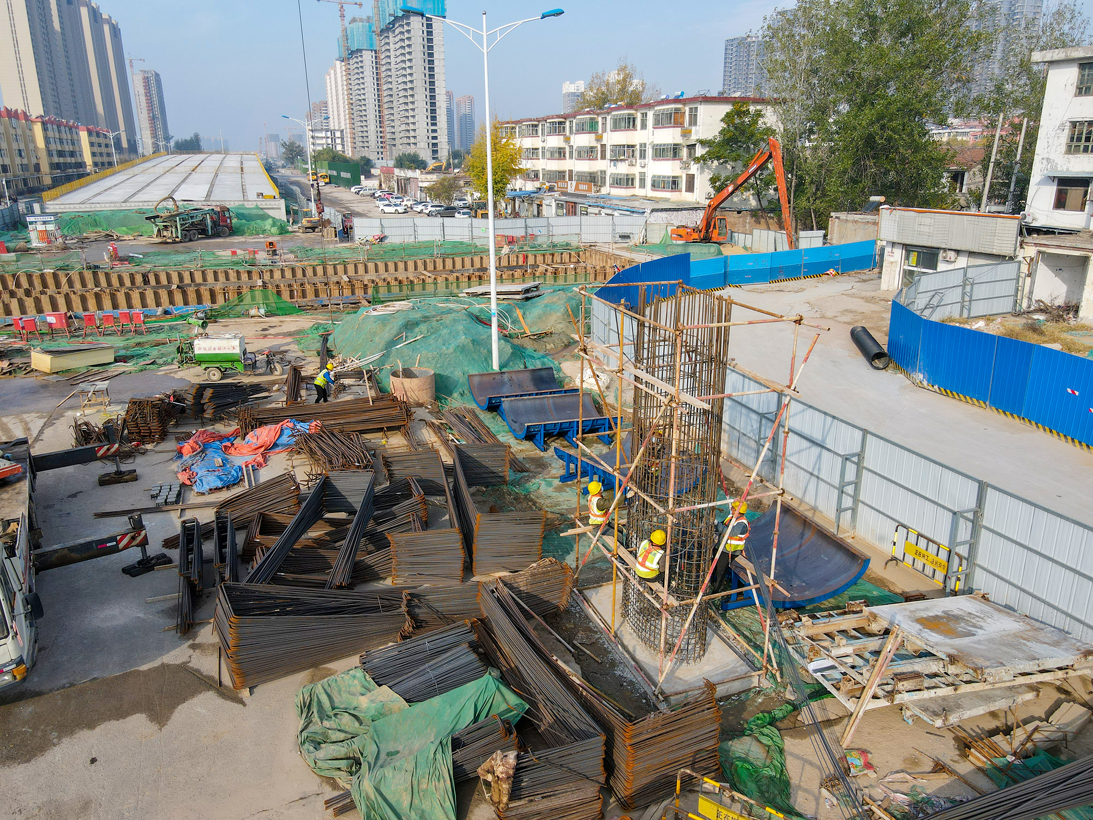 跨快速路人行天桥立柱钢筋绑扎作业