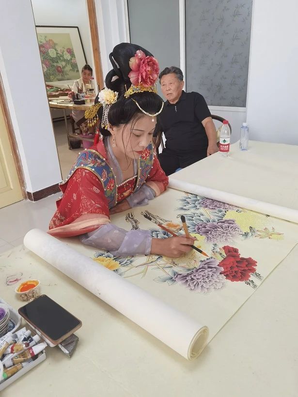 这张照片就是轰动一时的巨幅工笔画《盛世长虹》。这幅画去年曾经绽放美国纽约时代广场,向世界展示了中国工笔牡丹画的艺术魅力。