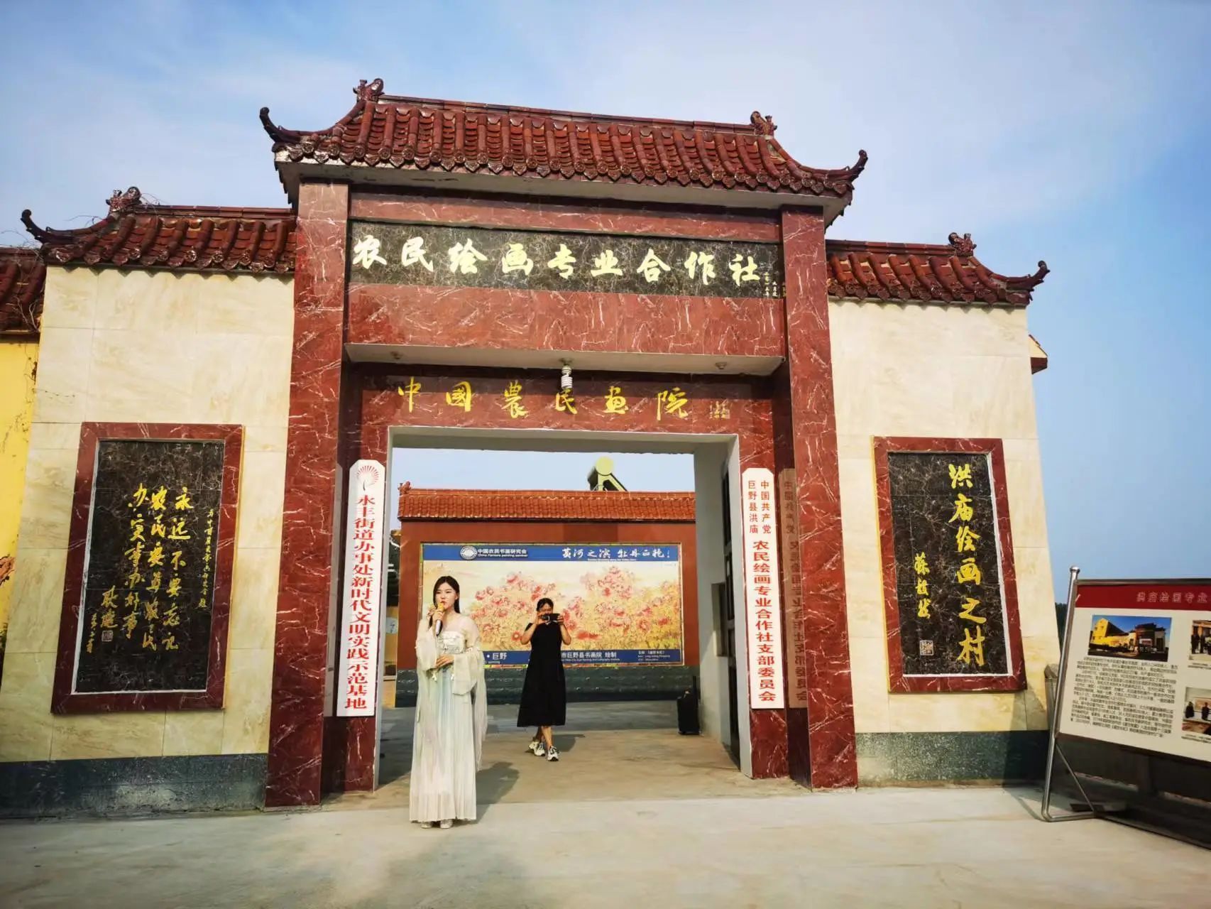 身着汉服的姚明月站在农民绘画专业合作社门口为大家介绍。(摄影:肖伟光)