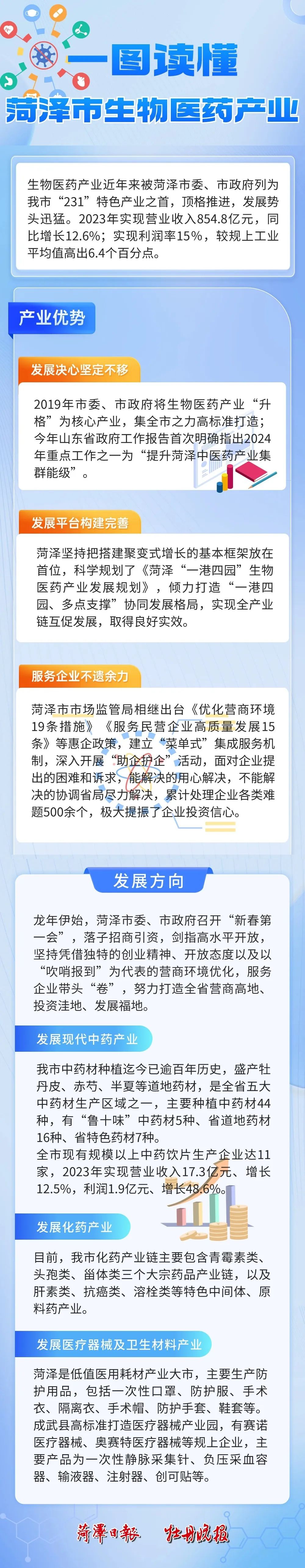 短短几年时间,菏泽的生物医药产业从无到有、从有到强,离不开政府的扶植政策和良好的营商环境。菏泽倾力打造“一港四园、多点支撑”协同发展格局,产业集聚效应更加明显,当前,业态一流、产业一流、模式一流的现代医药港初具气象,已签约项目50余个;鲁西新区、定陶区、鄄城、郓城四个专业园区集聚发展,形成了“一港四园”发展格局,千亿级产值、百亿级税收的产业集群呼之欲出。