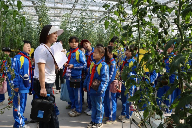 活动中,作为代表的四年级学生以班级为单位进行分组循环参观。依次参观了研学基地内的各项景点,包括无土栽培七彩西红柿大棚和园区内的动物园等。