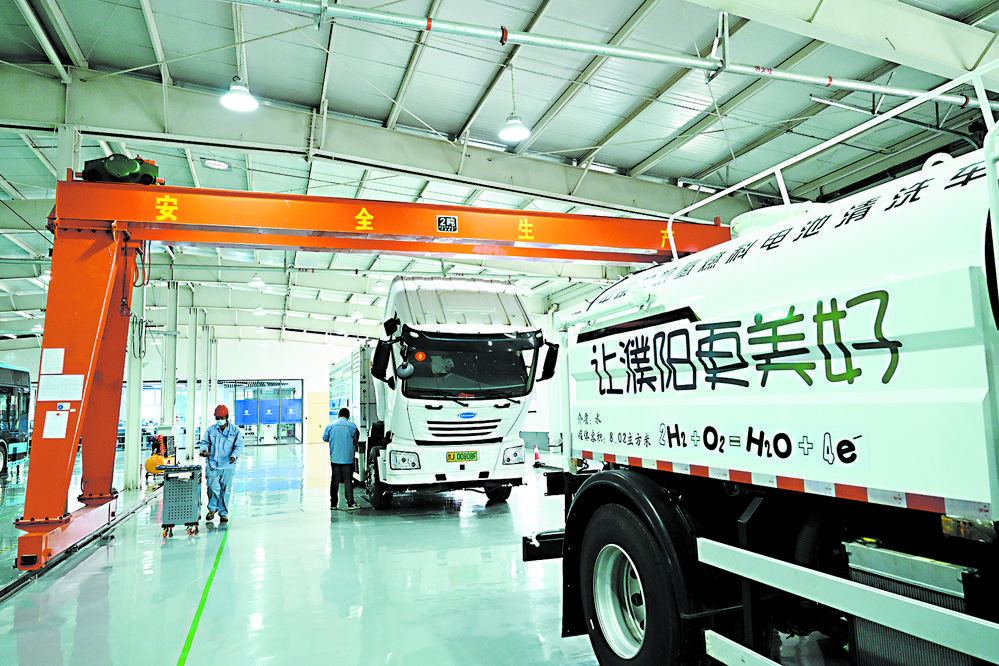 中沁泰康科技能源集团(濮阳)产业园内,氢燃料电池的特种洗扫车陆续交付下线并投放市场