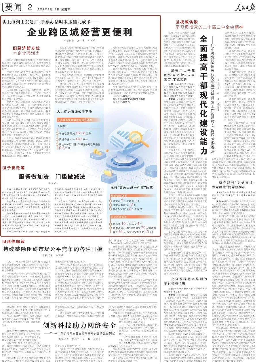 9月18日,《人民日报》第二版大篇幅述评结合报道菏泽市优化营商环境创新举措和成效。为助力外地企业顺利落户,鲁西新区开通手续办理绿色通道,采取“一事一议”“集体会诊”等举措,配备项目服务专员及时协调解决项目建设中的困难和问题。海希储能落户菏泽的总办理时限从94个工作日压缩至8个工作日,落户不到两个月,就配齐了第一条生产线并实现投产。近年来,菏泽市持续深化审批服务改革,推进审批服务减环节、减材料、减时限、减跑动。目前,可实现“一个行业一张综合许可证”,用地规划、土地成交同步公示,工程规划类许可“一证办结”“多审合一”,办事时间压减3/4。去年,全市并联审批率达72.24%,联合验收项目227个。
