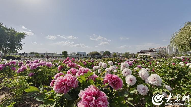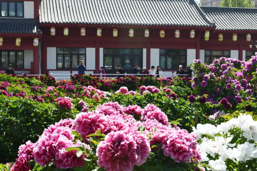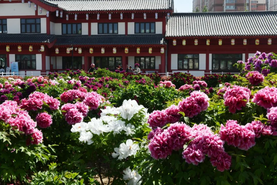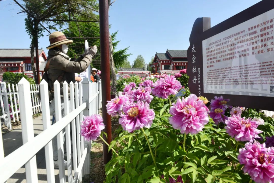 4月13日,曹州百花园内900余株太空牡丹迎风舒展。
