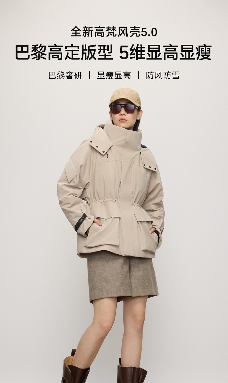同步面世的高梵风壳鹅绒服5.0则瞄准户外场景。女款采用黑石耐磨纱PRO5.0面料,实现10倍耐磨性能与≤1MM/S的极致防风效果,静水压10000+、透湿性6000+等指标重新定义户外防护标准;男款应用减重30%的黑石纱Light5.0,在保持同等防风防泼水性能同时提升便携性。双系列均搭载动态通风系统与德国金膜,并由巴黎奢研中心大师调色,新增鎏金、紫金、铂金三款高级色调。