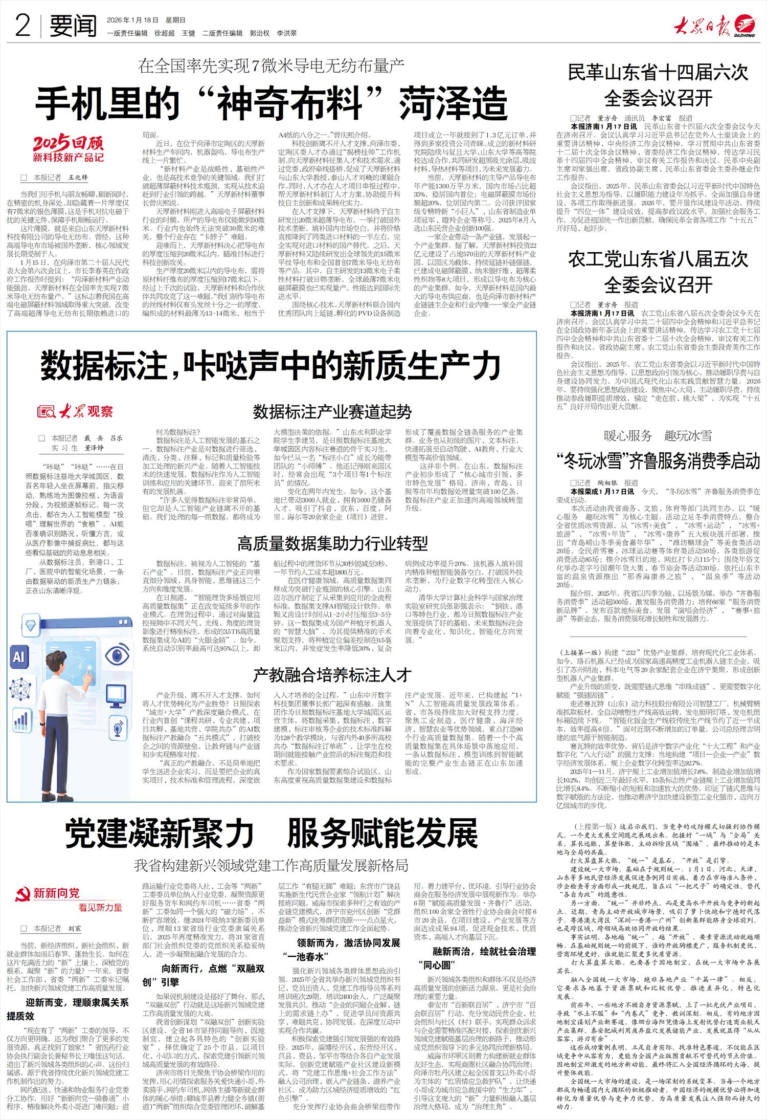 1月15日,在菏泽市第二十届人民代表大会第六次会议上,市长李春英在作政府工作报告时提到:“菏泽新材料产业动能强劲,天厚新材料在全国率先实现7微米导电无纺布量产。”这标志着我国在高端电磁屏蔽材料领域取得重大突破,改变了高端超薄导电无纺布长期依赖进口的局面。