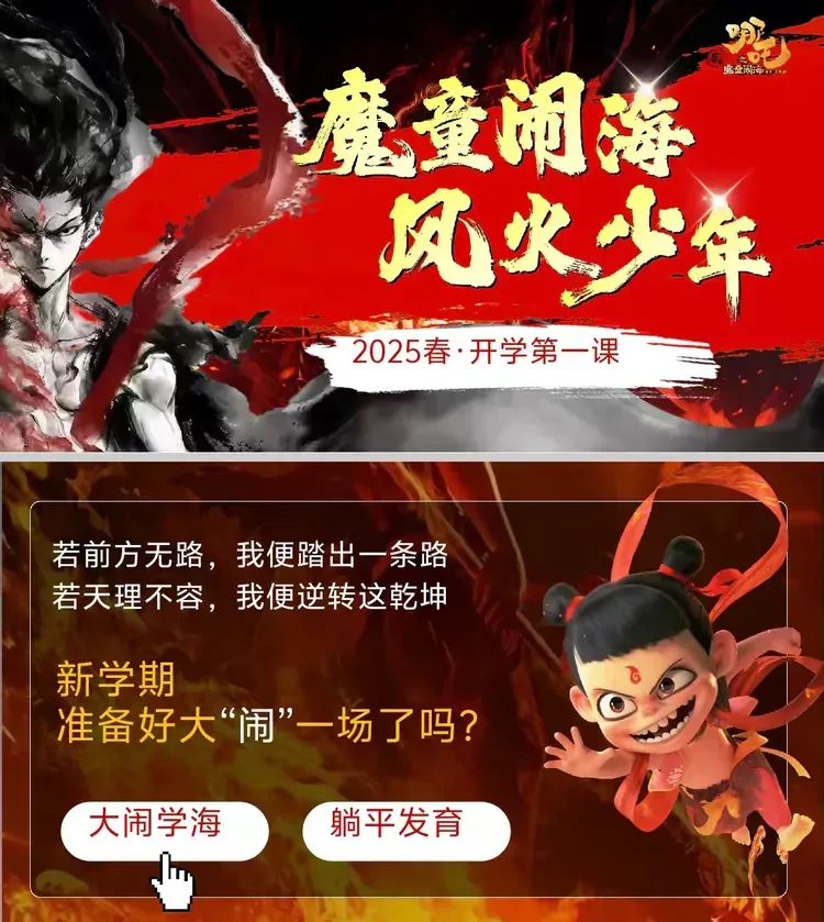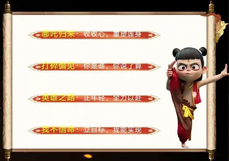学校以燃爆今春的《哪吒闹海》电影为切入点,结合学校和学生实际情况,精心打造以“魔童闹海 风火少年”为主题的学习课件,借哪吒精神,燃开学斗志。