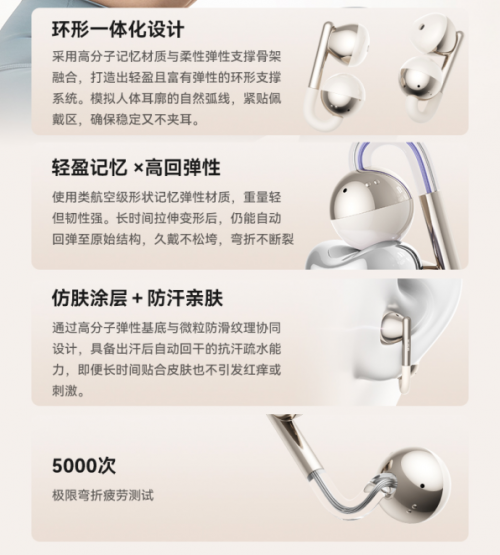 为了进一步提升使用体验,耳挂表层采用了仿肤涂层与抗汗亲肤设计。高分子弹性基底结合微粒防滑纹理,能够在运动出汗时迅速回干,长时间贴合也不闷、不痒。经过5000次极限弯折测试,依旧保持如初的稳定与耐用,无论是高强度使用还是日常使用场景,佩戴体验都近乎无懈可击。