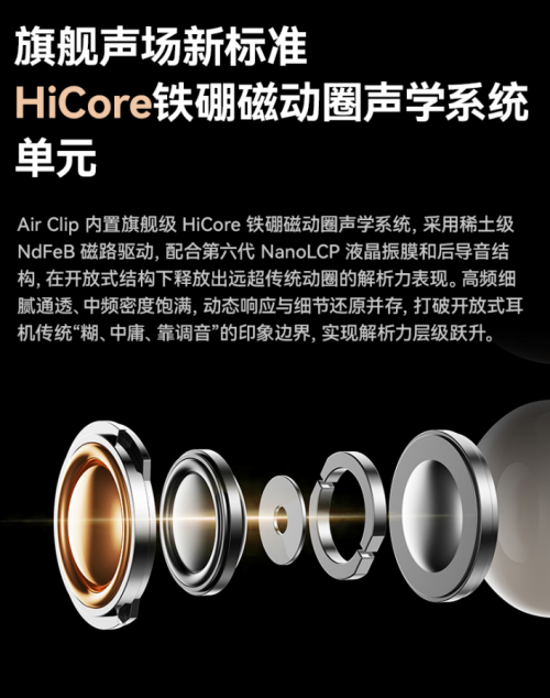 西圣AirClip内置旗舰级HiCore铁硼磁动圈声学系统,采用稀土级NdFeB磁路驱动,配合全新升级的第六代NanoLCP液晶振膜和后导音结构,在开放式设计下释放出远超传统动圈的解析力。