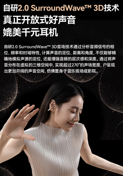 为了将耳机音质推向更高层次,西圣AirClip自主研发的2.0 SurroundWave™ 3D音场技术,通过精准分析音频信号的相位、频率和时域特性,实时计算声音的定位、距离与角度。该技术不仅能够精确模拟声源位置,还显著增强音频的层次感与纵深感。借助虚拟三维空间的声音分布,AirClip实现超过270°的宽阔声场,让用户仿佛置身于现场音乐会或影院之中,享受沉浸式、旗舰级听感体验。