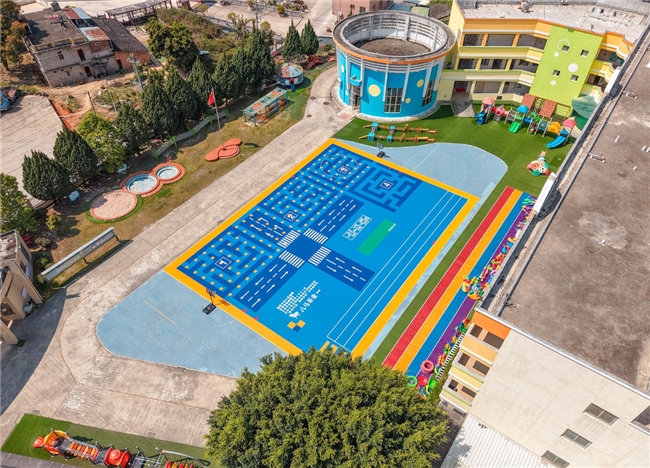在安溪县南翼新城第一幼儿园,崭新操场格外醒目——数千块彩色地板拼接而成的场地,兼具防滑、沥水、减震功能,蓝色跑道与绿色活动区相映成趣,成为孩子们欢乐的乐园。